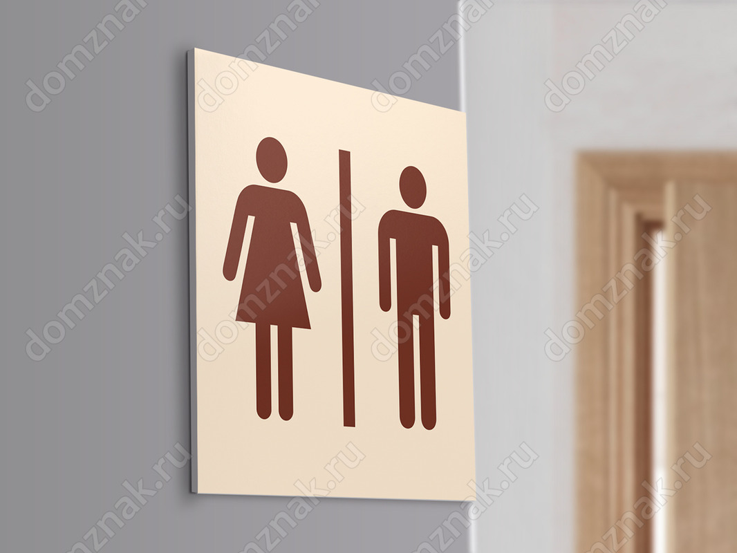 Табличка на дверь туалета изготавливается из пластика ПВХ белого цвета (толщина 3 мм). Изображение наносится плёнкой Oracal 641, либо методом полноцветной печати.